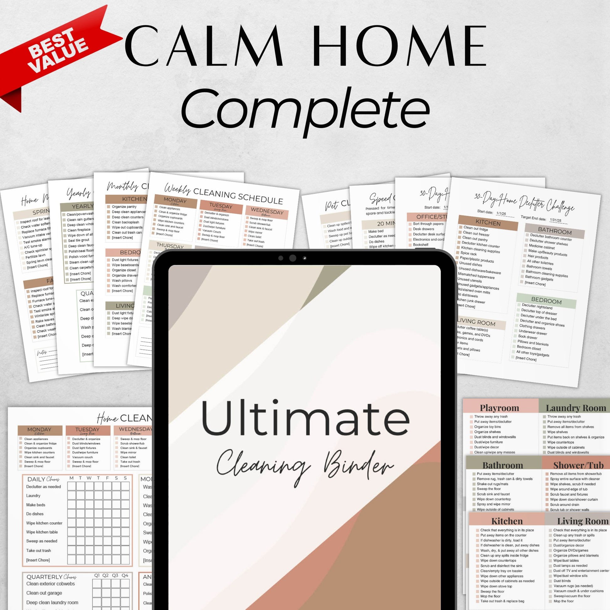 - Everything in Calm Home Starter (checklists, schedules, declutter, speed-clean, cleaning cards, ⭐ Bonus One-Sheet All-in-One)